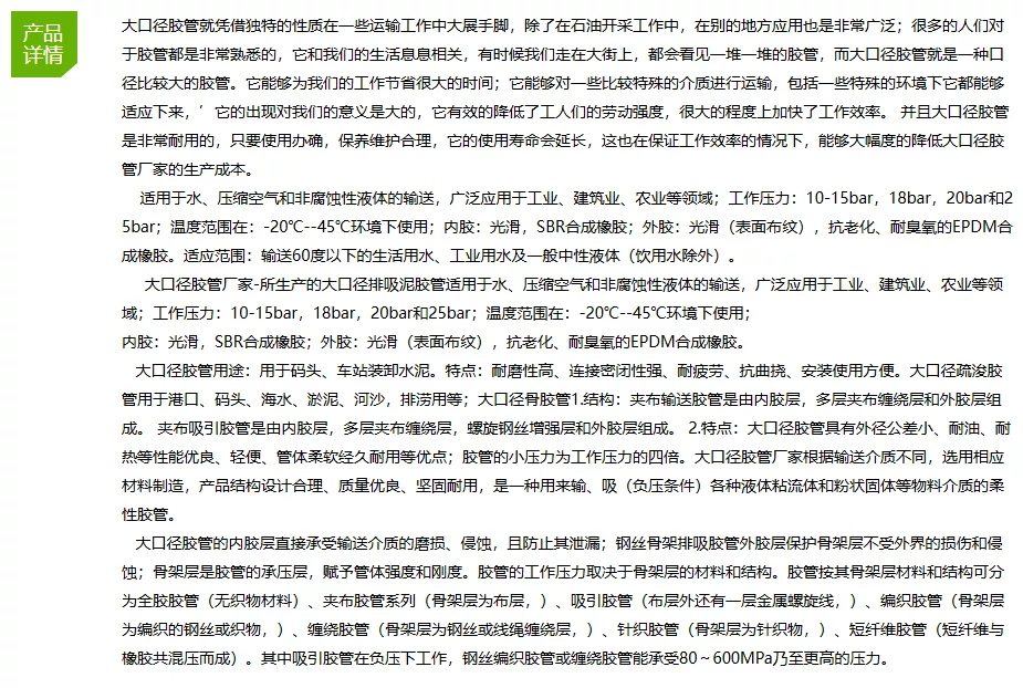 衡水貝源管業(yè)有限公司以經(jīng)營高壓膠管、液壓膠管、夾布膠管、噴砂膠管、注水封孔器、鋼絲編織、纏繞高壓、超高壓膠管、氣動管、噴砂管、吹氧管、鉆探管、酒機配件及不銹鋼金屬軟管、產(chǎn)品承受壓力高、彎曲半徑小、抗疲勞性能強、使用壽命長、廣泛用于冶金連鑄、石油鉆探、工程機械、礦山采掘及各類液壓機械。衡水貝源管業(yè)有限公司采用國外工藝,加之本廠技術人員的發(fā)明改造,質(zhì)量精益求精達至甚至超過美國派克公司和意大利阿基諾公司同類產(chǎn)品水平,可與國內(nèi)外各種液壓裝置快速連接。該產(chǎn)品多次被評為省、市優(yōu)質(zhì)產(chǎn)品,極具競爭力,暢銷不衰。