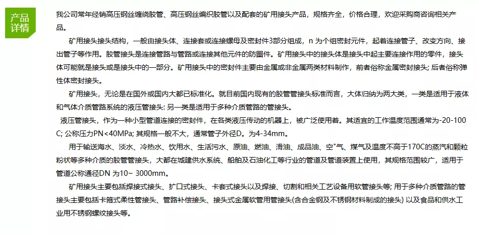 衡水貝源管業有限公司以經營高壓膠管、液壓膠管、夾布膠管、噴砂膠管、注水封孔器、鋼絲編織、纏繞高壓、超高壓膠管、氣動管、噴砂管、吹氧管、鉆探管、酒機配件及不銹鋼金屬軟管、產品承受壓力高、彎曲半徑小、抗疲勞性能強、使用壽命長、廣泛用于冶金連鑄、石油鉆探、工程機械、礦山采掘及各類液壓機械。衡水貝源管業有限公司采用國外工藝,加之本廠技術人員的發明改造,質量精益求精達至甚至超過美國派克公司和意大利阿基諾公司同類產品水平,可與國內外各種液壓裝置快速連接。該產品多次被評為省、市優質產品,極具競爭力,暢銷不衰。